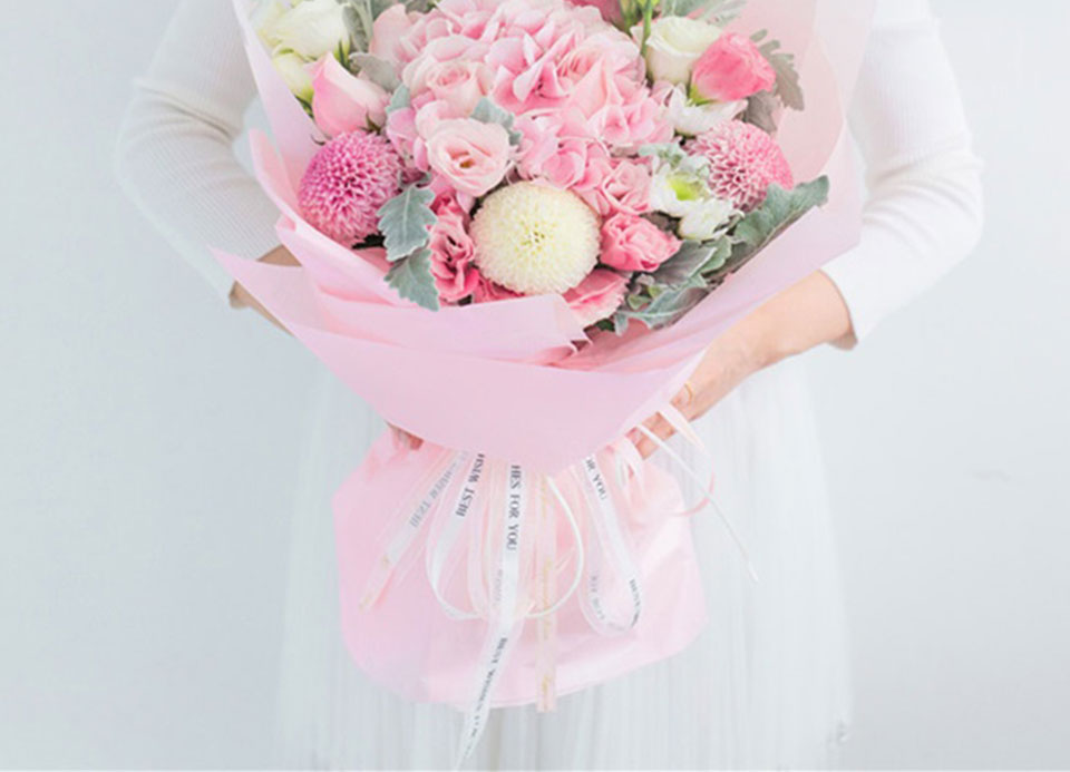 粉色雾面纸韩式扇形包装,精美白色英文字母缎带束扎。