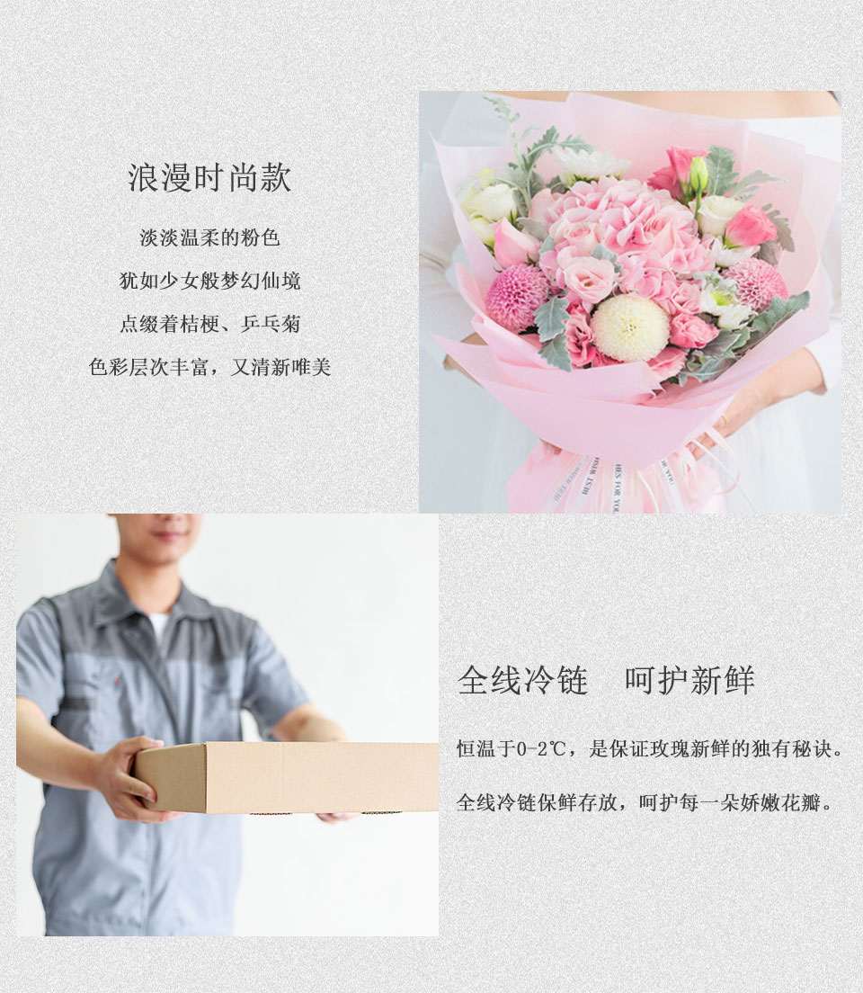 1朵粉绣球、3朵粉玫瑰(戴安娜)、2朵粉色乒乓菊、1朵白色乒乓菊,搭配2支粉色洋桔梗、3支白色洋桔梗、银叶菊装饰。
