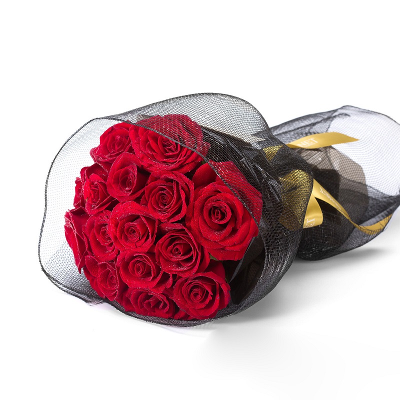黑色雾面纸、黑色硬网圆形包装,金色缎带蝴蝶结束扎。