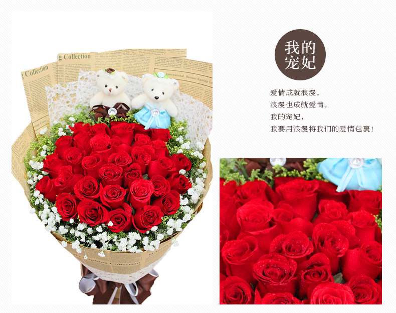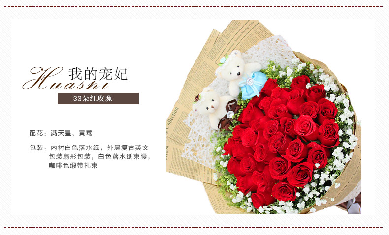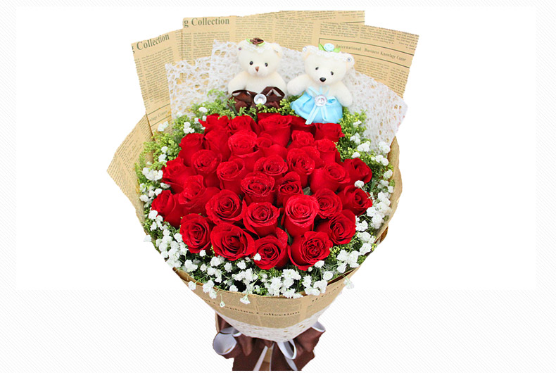 33朵红玫瑰,外围满天星丰满围边,黄莺间插,2只可爱熊
