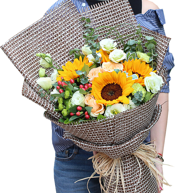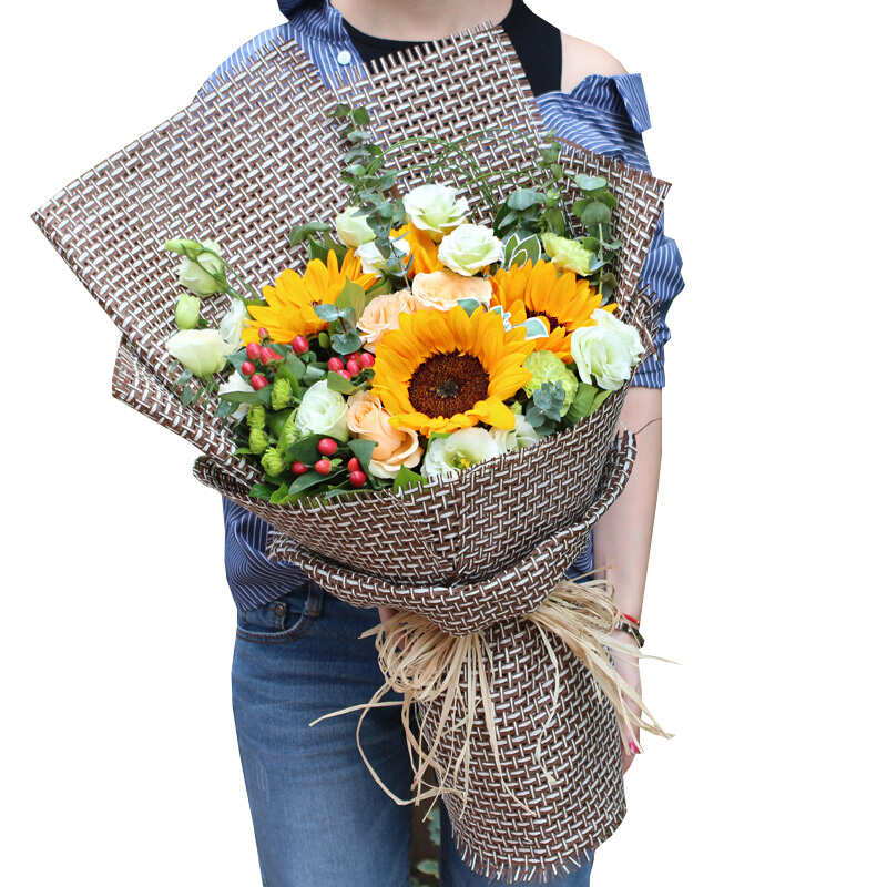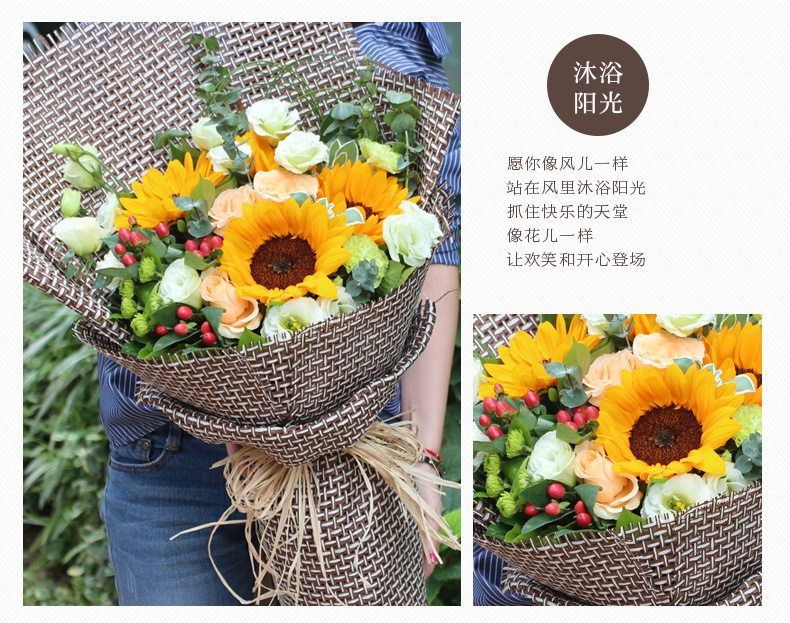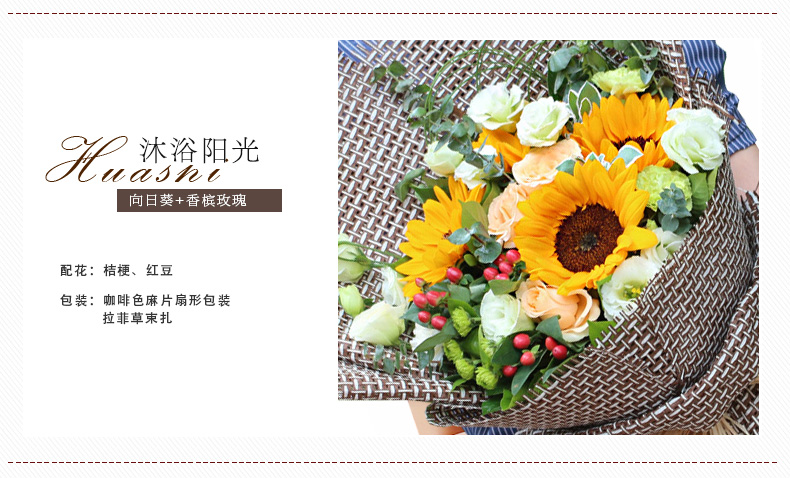 4支向日葵,4朵香槟玫瑰,绿康2支,绿桔梗适量,绿色小菊搭配,红豆适量,高山积雪、尤加利等点缀