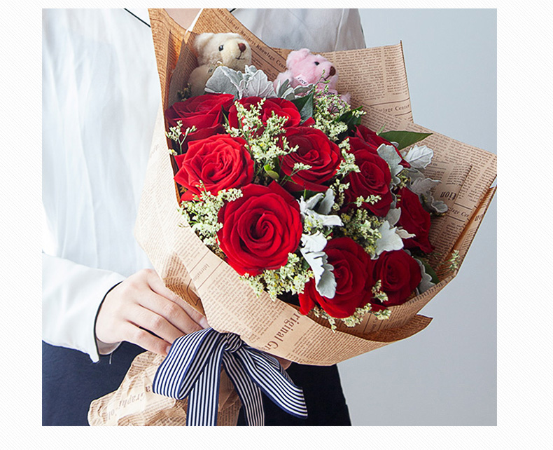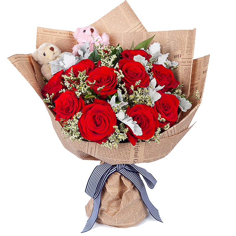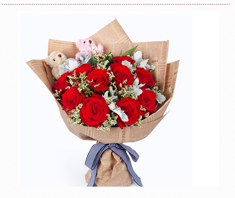 11朵红玫瑰,2只小熊,水晶草丰满,栀子叶和银叶菊搭配。