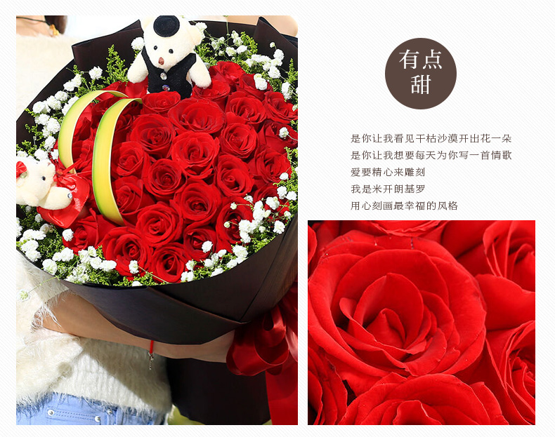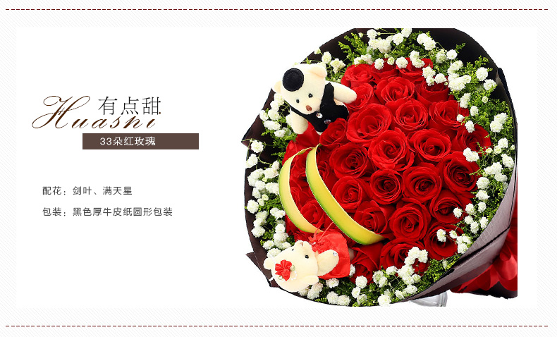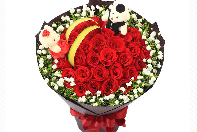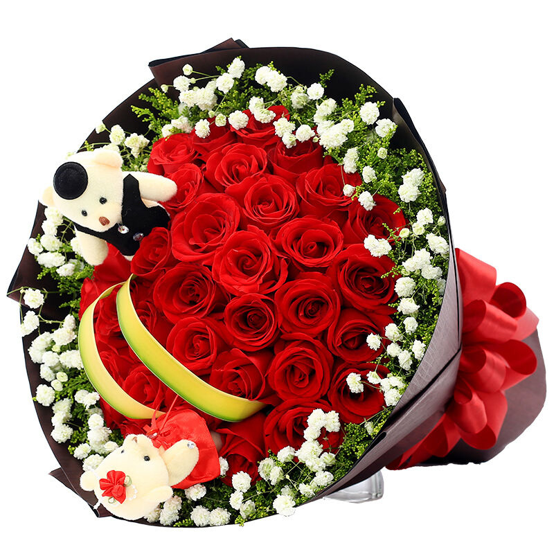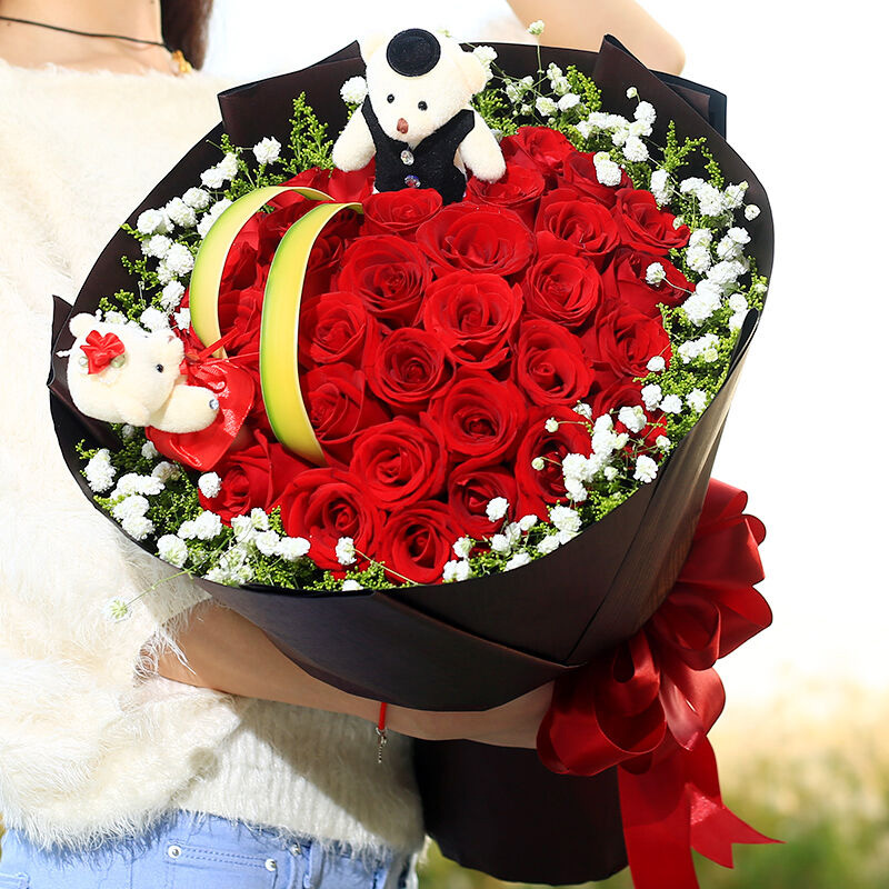 33朵红玫瑰,剑叶搭配,满天星丰满围边,送两只可爱小熊