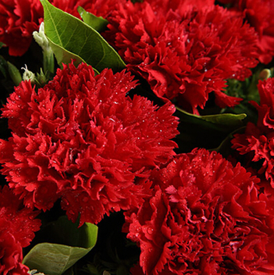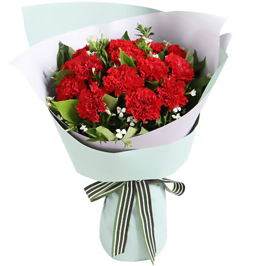 12支红色康乃馨,白色相思梅、栀子叶搭配。