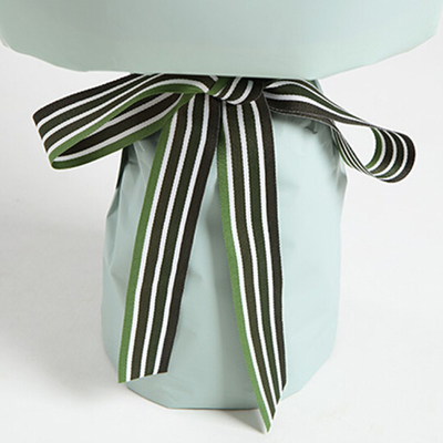 白色卡纸内衬,嫩绿色卡纸外包,配条纹丝带系蝴蝶结束扎。