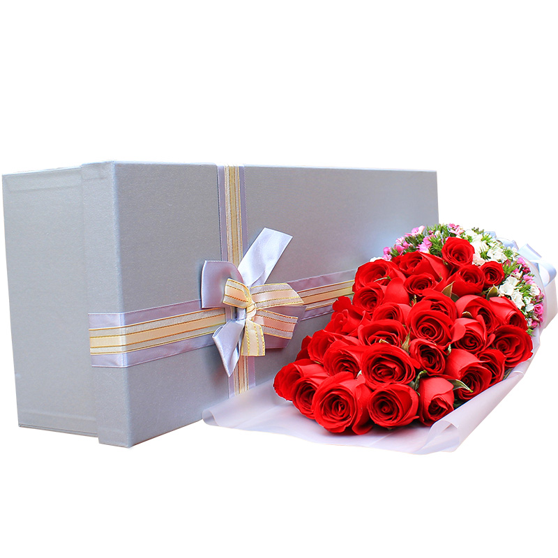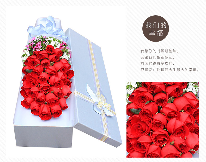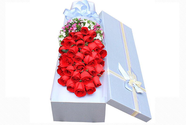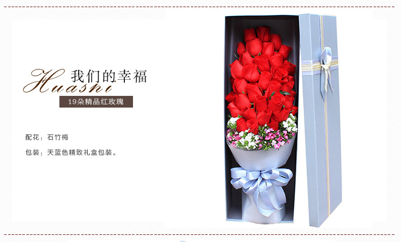 白色雾面纸包装,淡蓝色缎带束扎,精致礼盒包装。