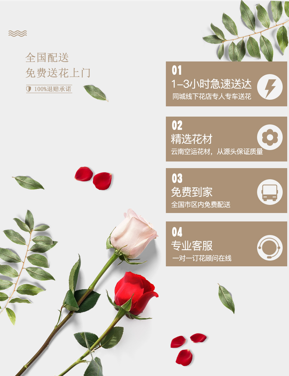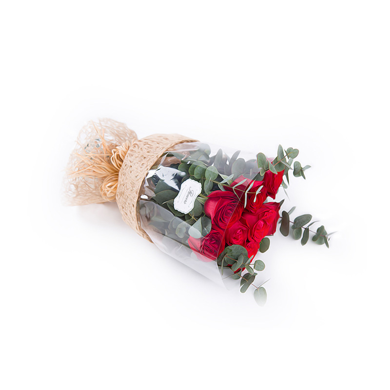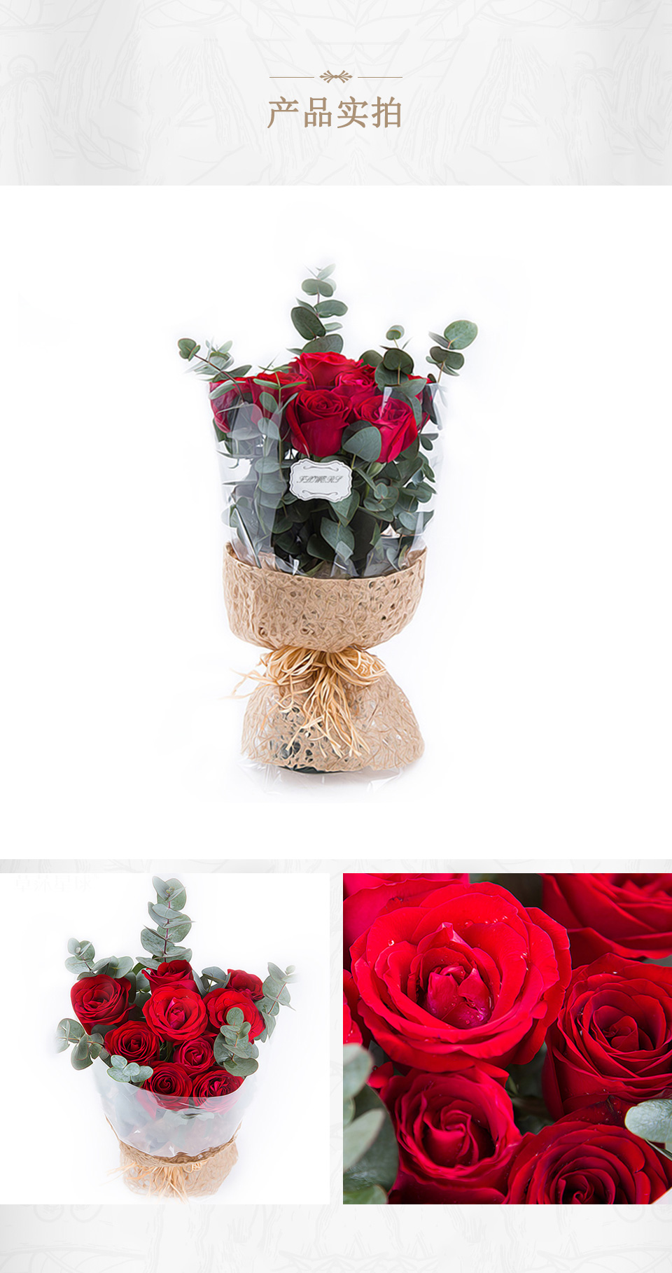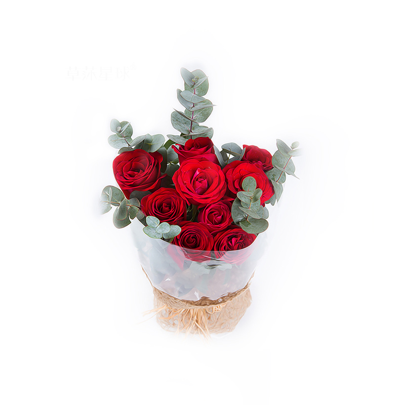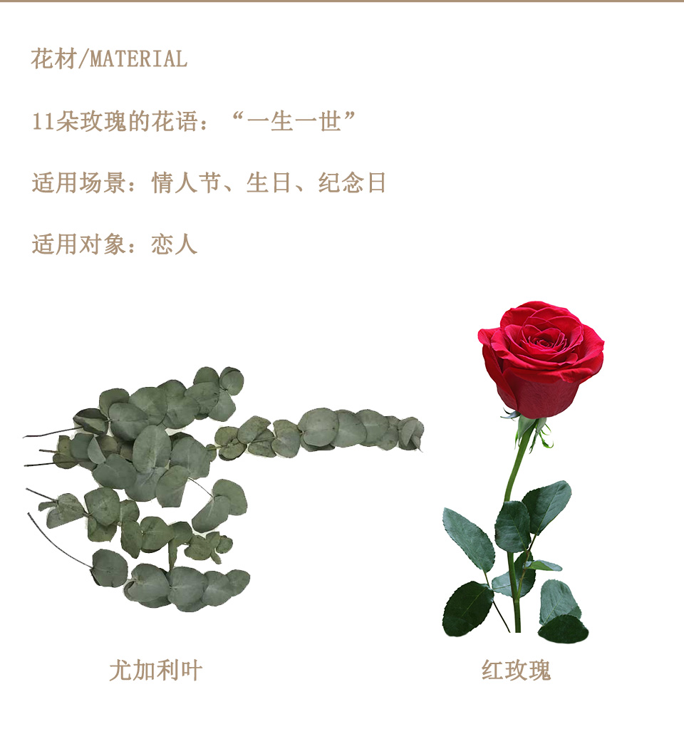 11朵红玫瑰,搭配适量尤加利叶装饰。