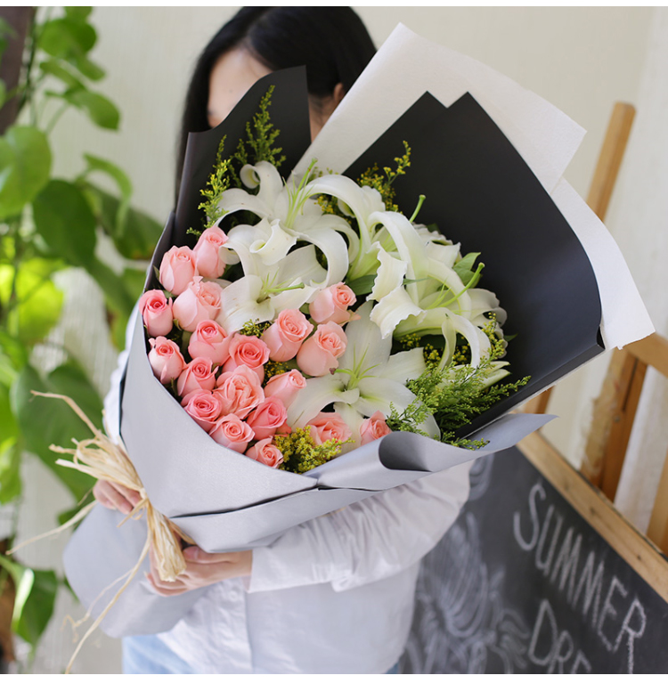 黑色硬纸、白色硬纸、灰色硬纸韩式扇形包装,精美拉菲草束扎。
