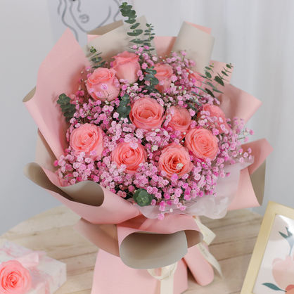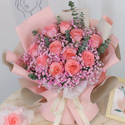 11枝戴安娜粉玫瑰搭配粉色满天星、尤加利叶