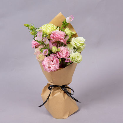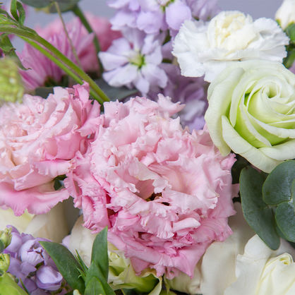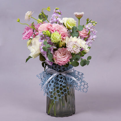 3枝白玫,3枝紫罗兰搭配1枝小菊,3枝绿桔梗,翠珠,尤加利叶(不含花瓶)