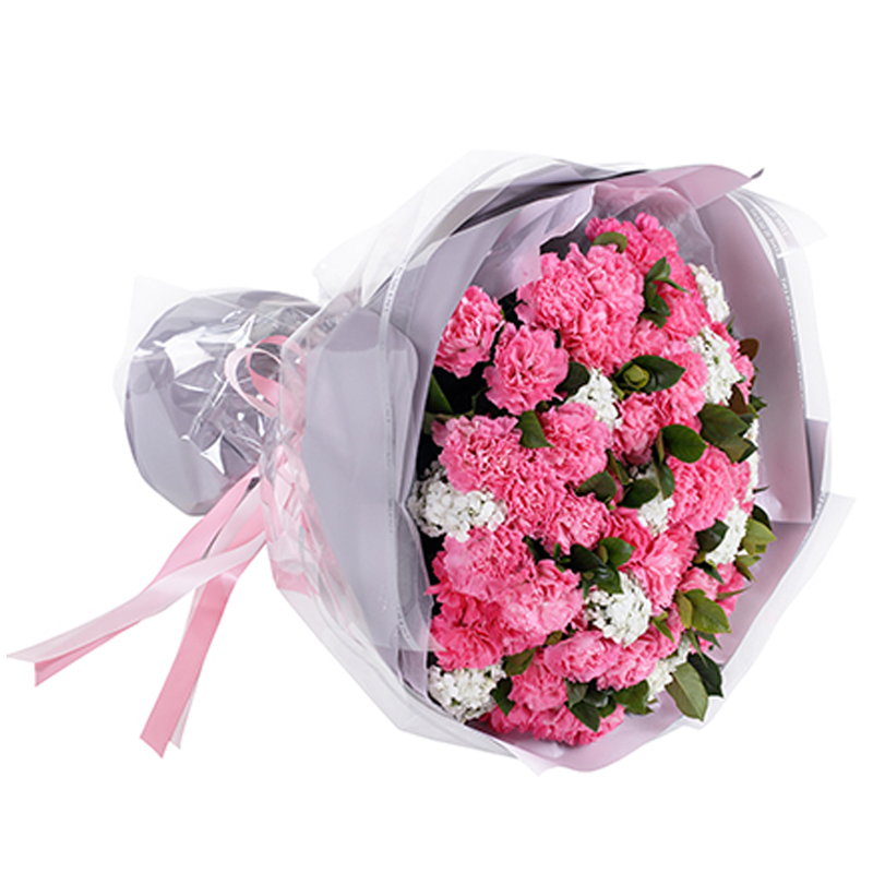 粉色康乃馨66枝搭配栀子叶、白色石竹梅