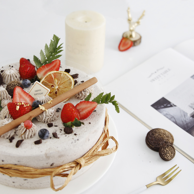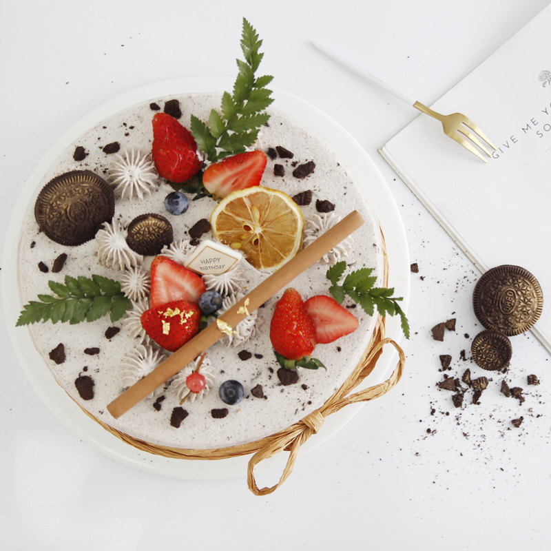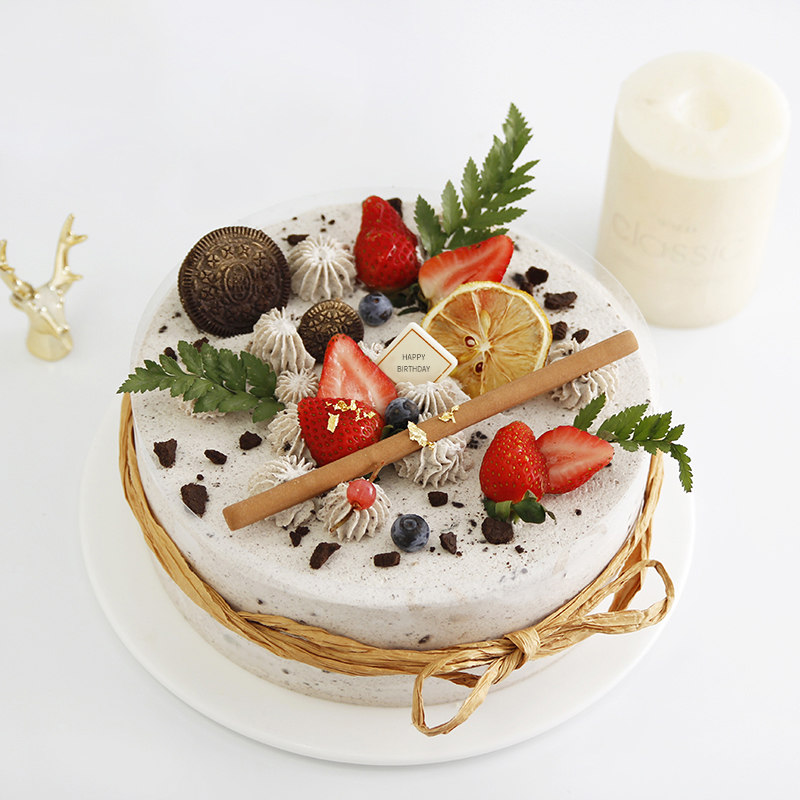 8寸圆形奥利奥鲜奶水果蛋糕,原味海绵蛋糕胚-奥利奥乳脂奶油(含法式薄脆片填充),表层草莓、蓝莓、奥利奥碎等装饰。(本款产品适宜食用温度为0-4摄氏度之间,请收到蛋糕后立即放入冰箱贮存)