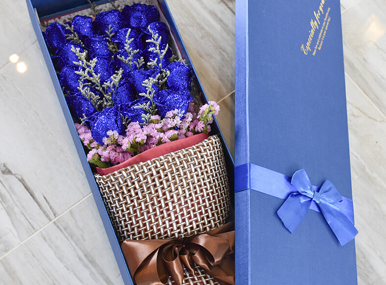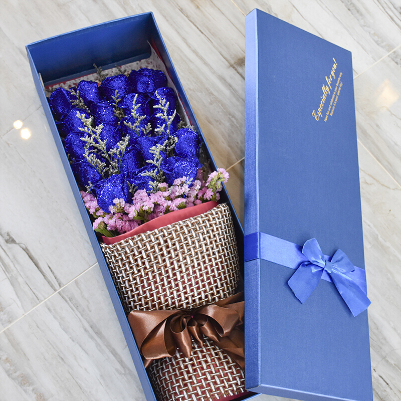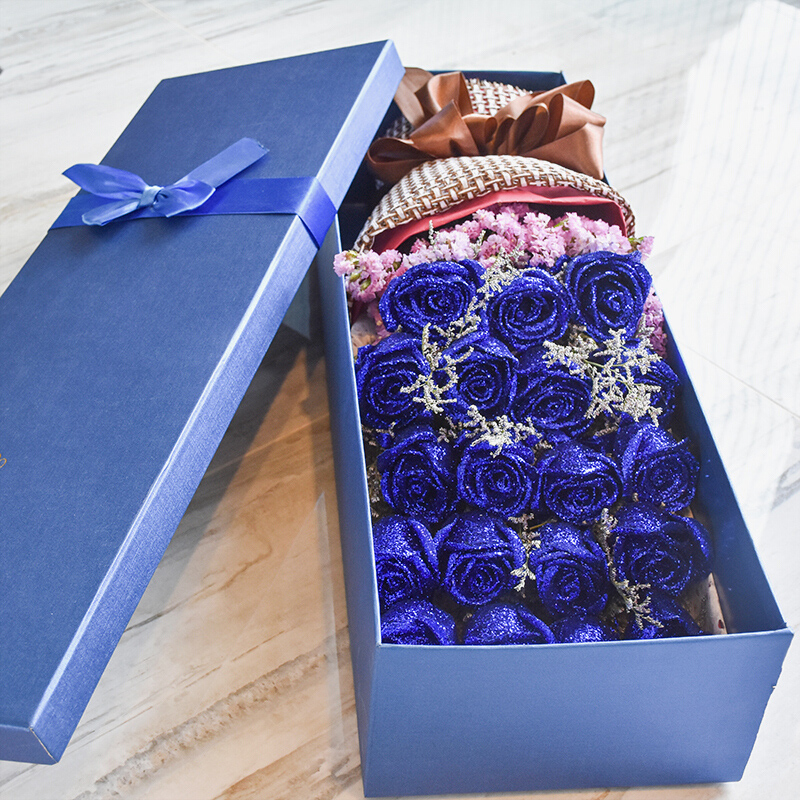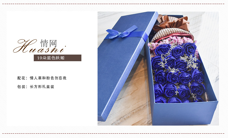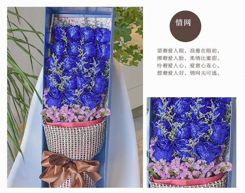 19支蓝色妖姬,情人草间插,粉色勿忘我搭配。