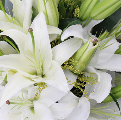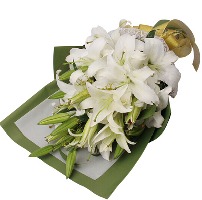 白色礼品纸加绿色礼品纸包装,蕾丝网托底,金色丝带系蝴蝶结束扎。