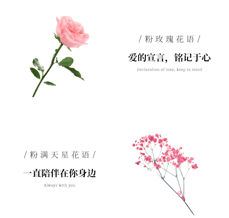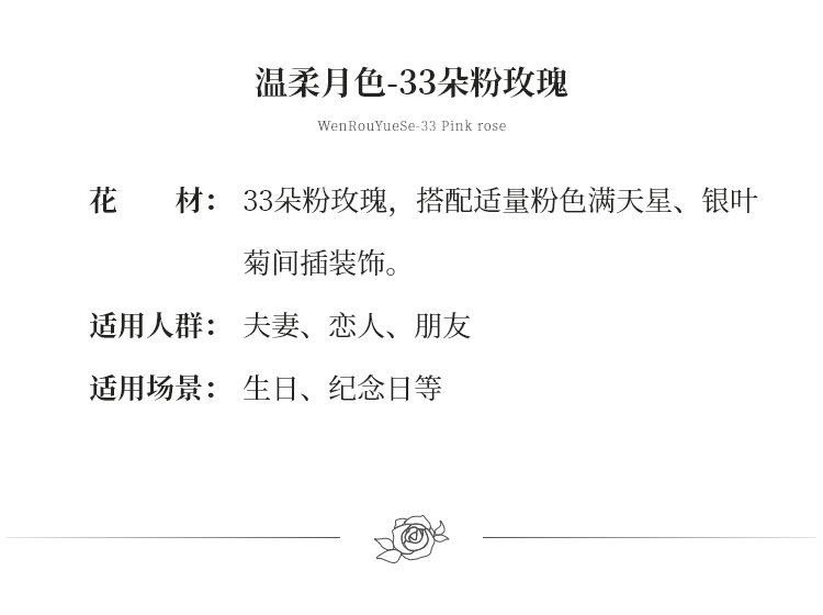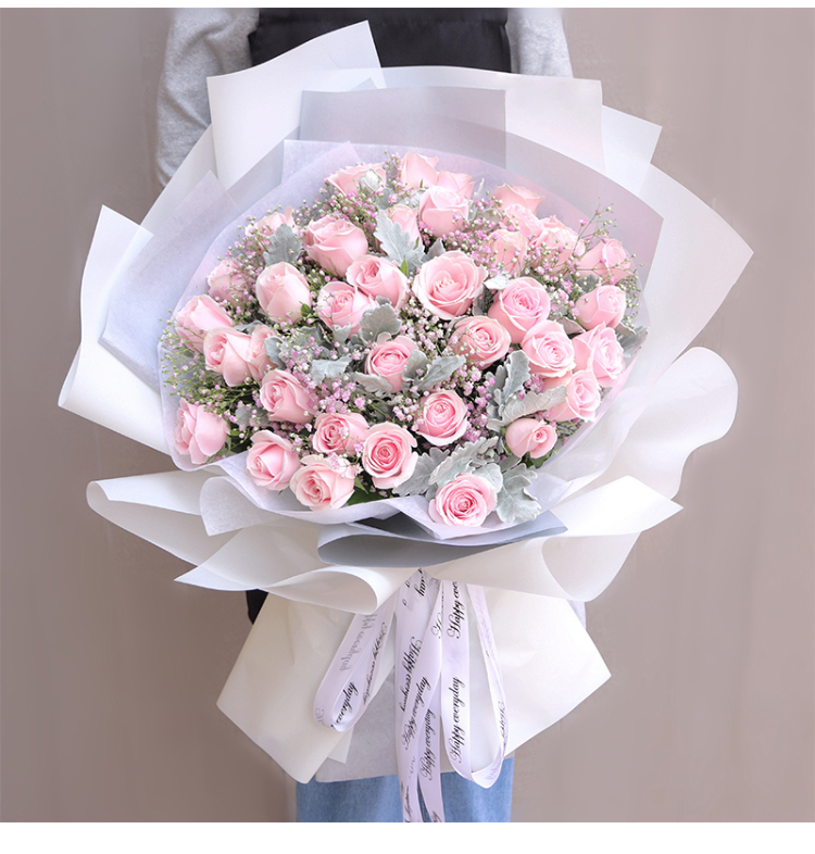 33朵粉玫瑰,搭配适量粉色满天星、银叶菊间插装饰。